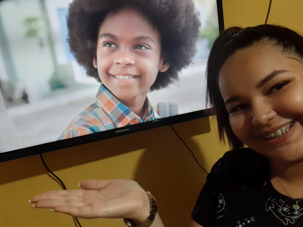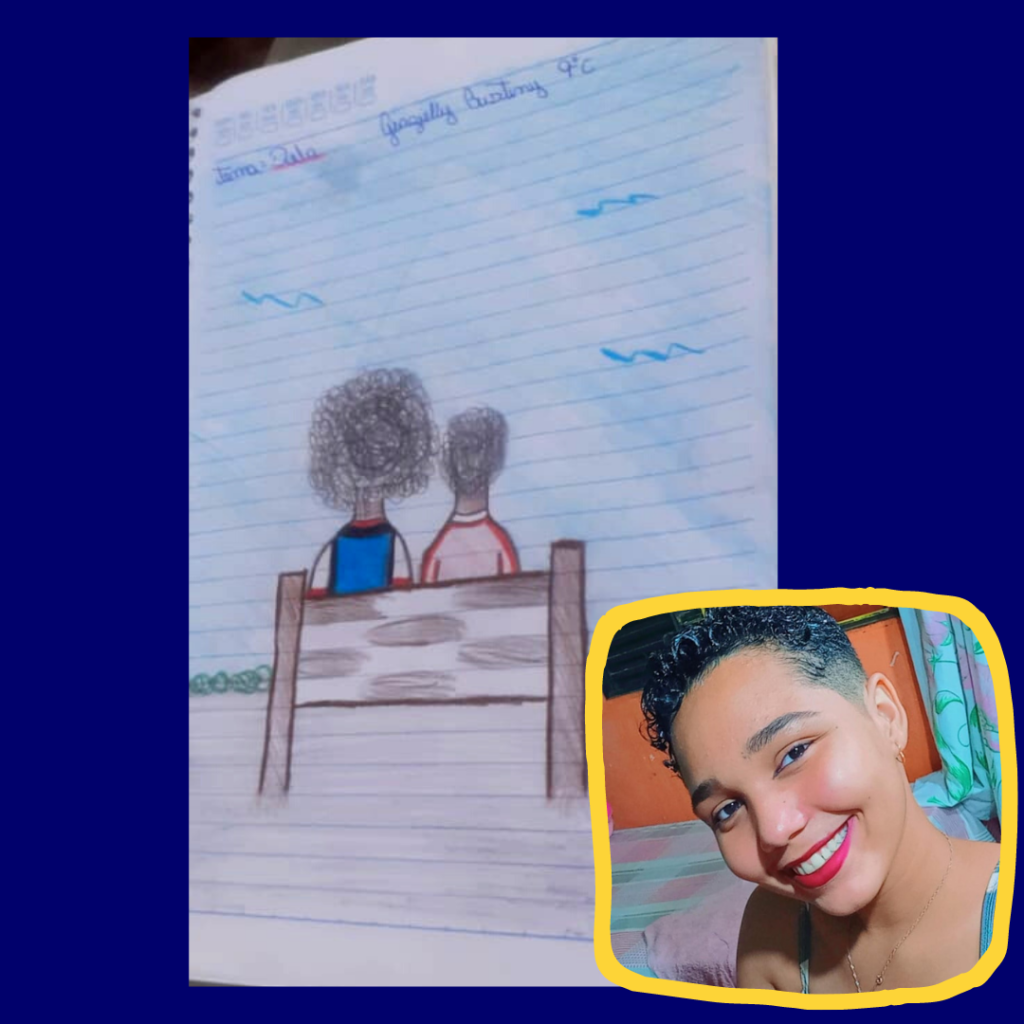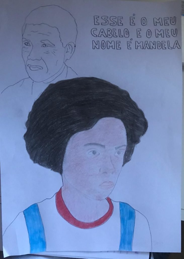 Desenho de Grazielly inspirado no filme "Dela", de Bernard Attal. "Achei linda, a forma que o pai explicou para ela o porquê do nome dela ser Mandela, a maneira como ela respondia quando as pessoas faziam Bullying com ela, eu acho que toda criança deveria ter resposta na ponta da língua como ela tem. Gostei muito! Mostra coisas que muita das vezes o mundo fecha os olhos, já sofri o mesmo que aquela menininha, só que por conta de ser gorda, gostaria muito de quando eu sofri Bullying ter a resposta na ponta da língua como ela". Grazielly da Silva