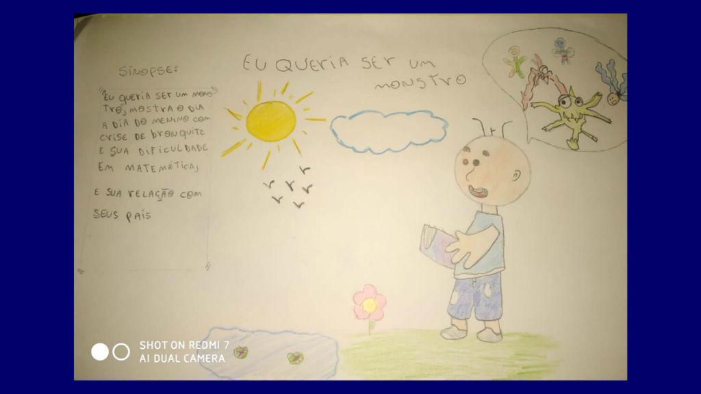 "Eu Queria Ser Um Mostro mostra o dia a dia do menino com crise de bronquite e sua dificuldade em matemática e sua relação com seus pais". Desenho e impressões de Kariny Amorim sobre o filme "Eu Queria Ser Um Monstro", de Marcelo Marão.