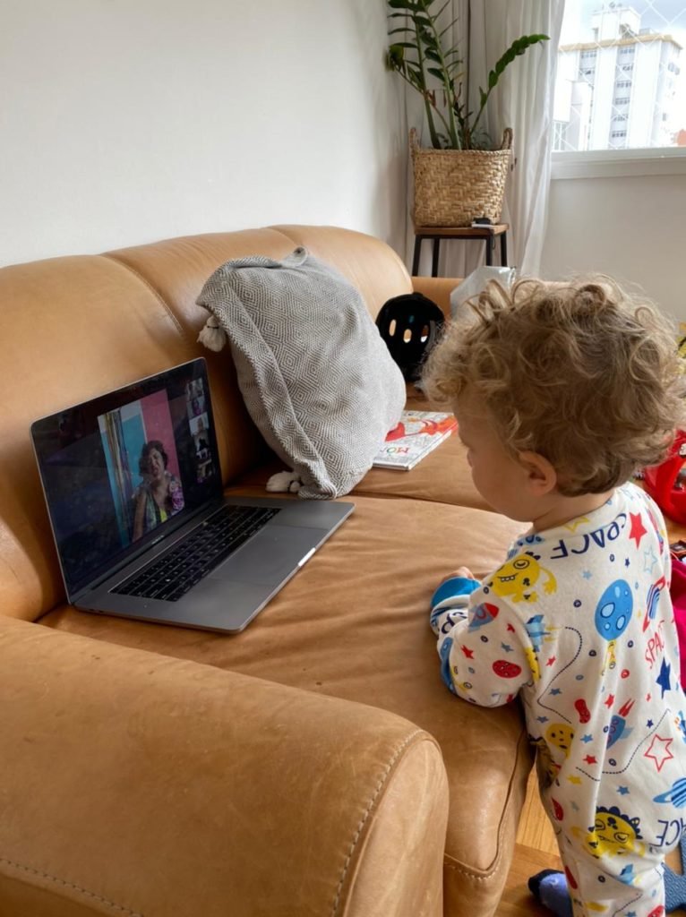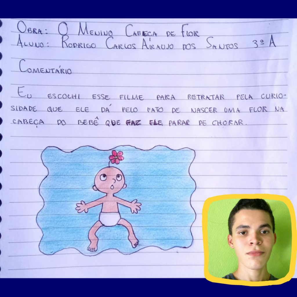 "Eu escolhi esse desenho para retratar pela curiosidade que ele dá pelo fato de nascer uma flor na cabeça do bebê que faz ele parar de chorar". Comentário e desenho de Rodrigo, inspirado no filme "O Menino Cabeça de Flor", de Vanessa Heeger.